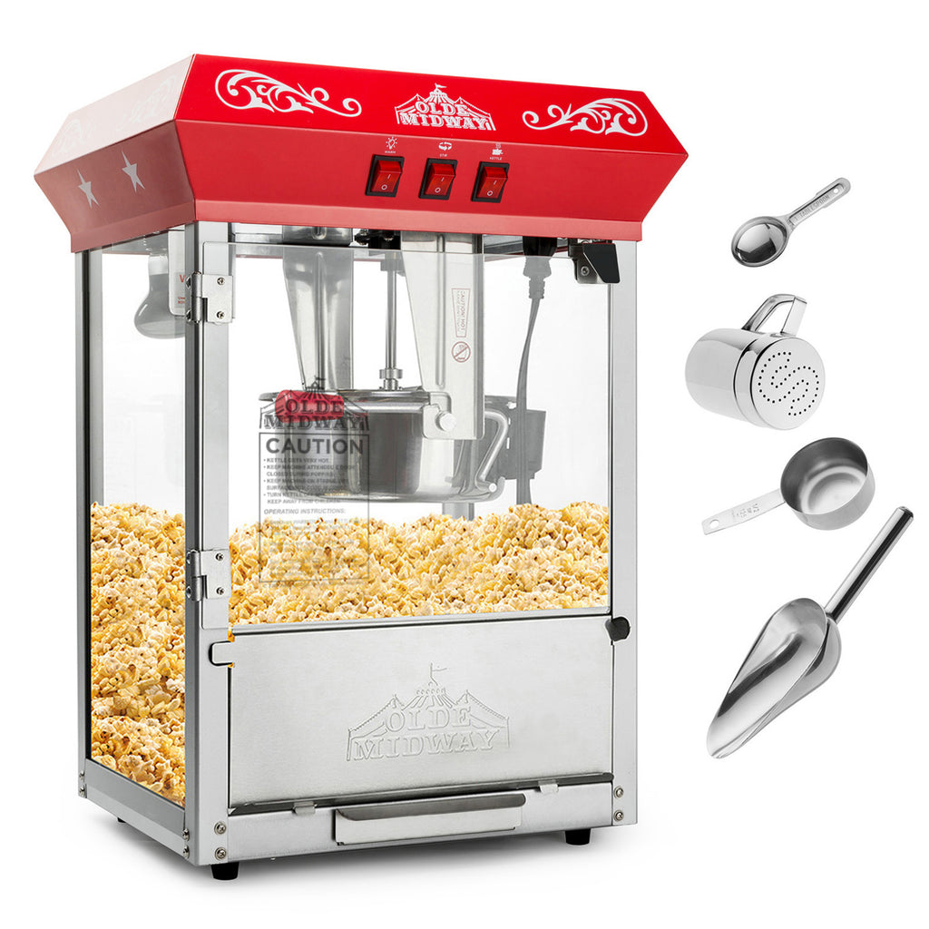 Enjoy making gourmet, movie-theatre style popcorn anywhere with the Olde Midway antique style tabletop popcorn machine. Offering nostalgic charm with a retro-style design, this premium-quality popcorn machine is equipped with completely modernized features for convenient, easy operation and lasting functionality. Ideal for adding novelty at school and church fundraisers and carnivals, businesses, parties, little league, and varsity games, home movie theatres, and much more, this 10-ounce kettle can produce about 4-gallons of popcorn per batch to satisfy large crowds. Makes a great gift for movie buffs. Constructed of highly durable materials including heavy-duty powder coated steel and stainless steel food zones, tempered safety glass walls, vibrant, richly pigmented premium paint, and a powerful, commercial-quality motor, this deluxe popcorn machine is built to last. Convenient 3-switch operation includes a spot light warmer, stirrer, and pot heater. The machine includes a warming deck and heat light to keep popcorn fresh and delicious, as well as a drawer to catch any un-popped kernels for a perfect batch every time. Cleans easily with water, and runs on a US-standard 120 volt power cord for quick and easy setup almost anywhere. Includes the following stainless steel accessories: 1/2 cup measuring cup, tablespoon, popcorn scoop, and salt shaker. Minor assembly is required. Olde Midway is well-known within the industry for finely crafted, specialty appliances that combine stylish design with exceptional durability at a great value.