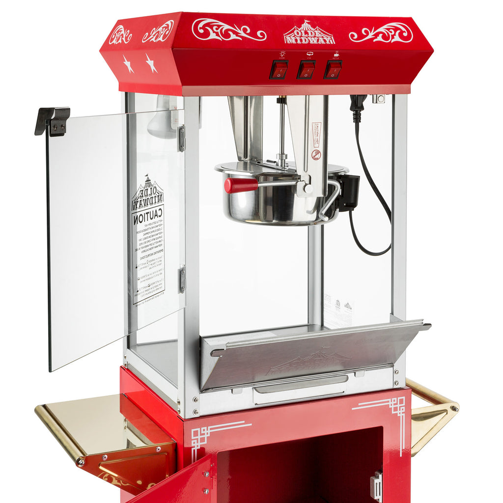 Enjoy making gourmet, movie-theatre style popcorn anywhere with the Olde Midway antique style popcorn machine and deluxe cart. Offering nostalgic charm with a retro-style design, this premium-quality popcorn machine is equipped with completely modernized features for convenient, easy operation and lasting functionality. Ideal for adding novelty at school and church fundraisers and carnivals, businesses, parties, little league, and varsity games, home movie theatres, and much more, this 10-ounce kettle can produce about 4-gallons of popcorn per batch to satisfy large crowds. Also makes a great gift for movie buffs. Constructed of highly durable materials including heavy-duty powder coated steel and stainless steel food zones, tempered safety glass walls, vibrant, richly pigmented premium paint, and a powerful but whisper-quiet motor, this deluxe popcorn machine is built to last. Heavy-duty cart with high-quality hinges and handles provides convenient storage space for popcorn and accessories and is easily portable with it's large 16", bicycle-style, ball-bearing wheels. Durable welded legs with rubber-capped feet provide stability on all types of floors, as well as protect floors from scuff marks. Convenient 3-switch operation includes a spot light warmer, stirrer, and pot heater. The machine includes a warming deck and heat light to keep popcorn fresh and delicious, as well as a drawer to catch any un-popped kernels for a perfect batch every time. Cleans easily with water, and runs on a US-standard 120 volt power cord for quick and easy setup almost anywhere. Includes the following stainless steel accessories: 1/2 cup measuring cup, tablespoon, popcorn scoop, and salt shaker.